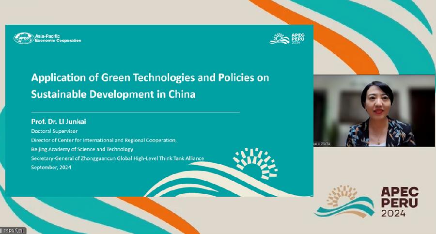 2024年09月30日李军凯做主旨报告会议现场近日,中关村全球高端智库联盟(简称智库联盟)秘书长、幸运彩国际与区域合作中心主任李军凯研究员,联盟秘书处办公室主任任蓉受邀线上参加了由秘鲁经济技术合作指导委员会主办的“通过中小微企业为具有韧性的经济体构建协作生态系统:可持续发展政策与新技术”研讨会。此次会议作为亚太经合组织(APEC)框架下的重要活动,于2024年9月9日于线上线下顺利举行。会上,李军凯发表了题为“中国绿色技术与政策在可持续发展中的应用”的主旨报告,报告深入阐述了中国在推动绿色技术和政策方面的努力与成就。李军凯表示,中国重视和支持中小微企业发展,通过一系列可持续发展政策和新技术应用不断提升企业的竞争力和适应能力,并致力于通过国际合作打造协同、有韧性的全球经济生态系统。李军凯的演讲得与会专家的高度评价,进一步提升了智库联盟的国际知名度与影响力。智库联盟一直致力于推动民间科技交流合作,促进