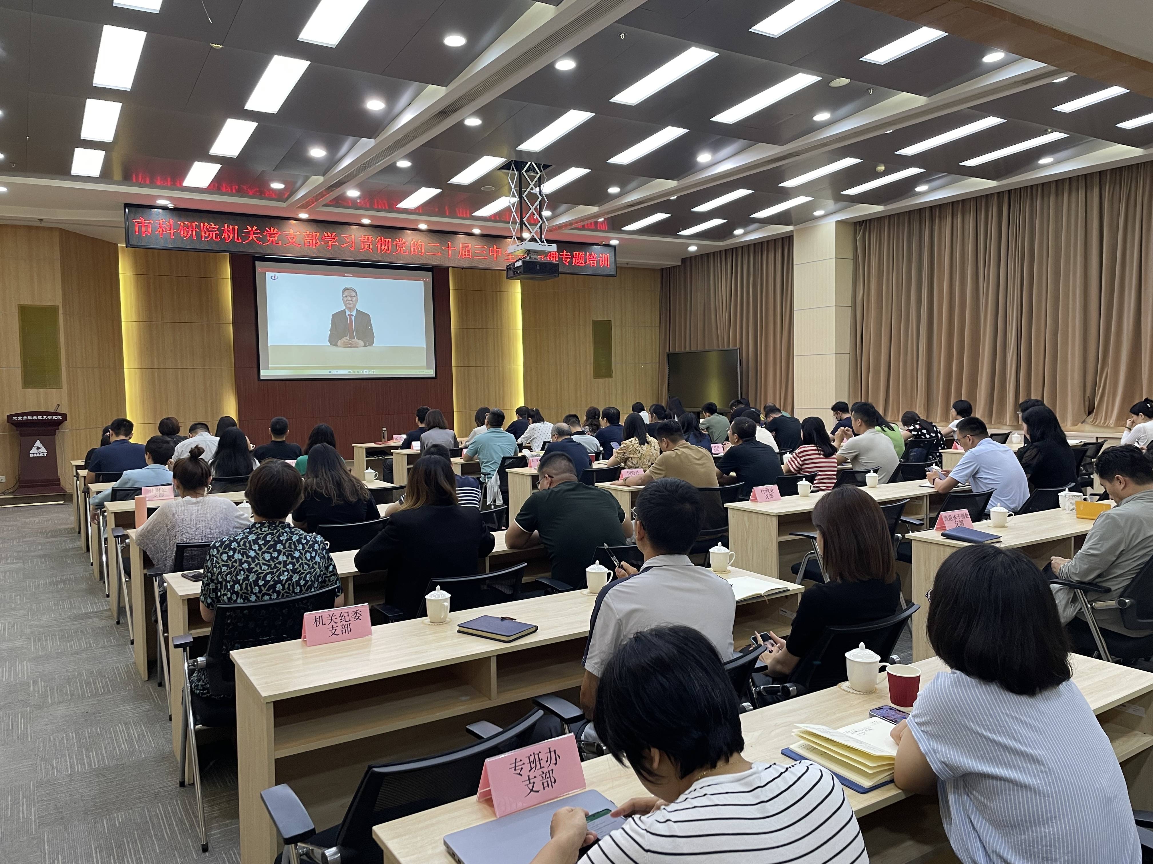 根据《院党组关于做好党的二十届三中全会精神学习宣传工作安排》和市委组织部“党支部云课堂”工作安排,8月16日下午,院机关党委组织机关各支部在北科大厦报告厅参加市委组织部“党支部云课堂”线上集中培训。此次线上培训主题为“学习贯彻党的二十届三中全会精神——进一步全面深化改革 为中国式现代化注入新动力”,主讲人为中央党校(国家行政学院)中国式现代化研究中心主任、教授张占斌。院党组副书记杨东起,院党组成员、副院长郑欣以及院机关各支部共计70余名党员参加集中培训。同时,院属各级党组织也纷纷通过各种方式组织党员们集中学习贯彻二十届三中全会精神,全院陆续兴起学习宣传贯彻热潮。