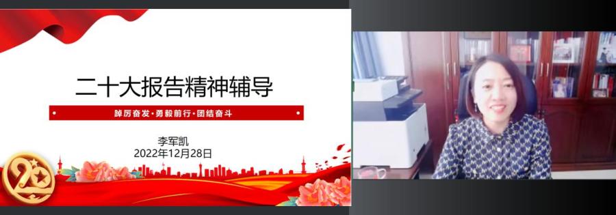 12月28日,幸运彩国际与区域合作中心(以下简称国合中心)党支部召开党的二十大精神宣讲辅导会,中心党支部书记、主任李军凯为中心党员作二十大报告精神专题辅导。