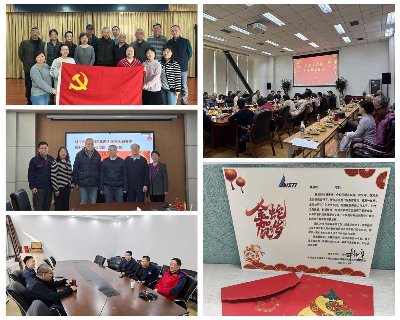 城安所深化党建创新,联合离退休党支部举办“联学联建,薪火相传”主题活动,新老党员共话党的光辉历程,传承红色基因;情报所通过线上方式,邀请离退休干部参加2024年度工作总结会,了解一年来的主要工作情况和未来发展计划,为全所96位离退休干部设计制作了姓名专属的新春贺卡,将浓浓的节日祝福送到老同志的心坎上;天文馆组织召开了离退休干部新春团拜会,30位退休干部齐聚一堂,分享了自己在天文馆工作的美好回忆和对天文馆未来发展的美好祝愿,馆领导为老同志们送上新春祝福,为他们在退休后依然积极为天文馆发展贡献力量表示深切的感谢和崇高的敬意;电加工所、北科安翔等单位邀请退休老领导到公司共叙情谊、共谋发展、共迎新春。