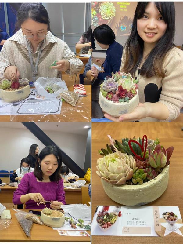 女职工首先认真倾听了关于植物生长规律和多肉种植养护的专业知识,对多肉植物的品种、生长环境、基础养护有了基本的认识。随后,备受职工期待的多肉盆栽手工制作活动正式开始,大家亲自动手,在古香古色的花盆里进行铺土、撒沙、栽培,将十几种生机勃勃、绿意盎然的多肉花株以完美的造型和布局展现在盆景中。活动现场,女职工们洋溢着欢乐的笑脸,如同早春温暖的太阳。