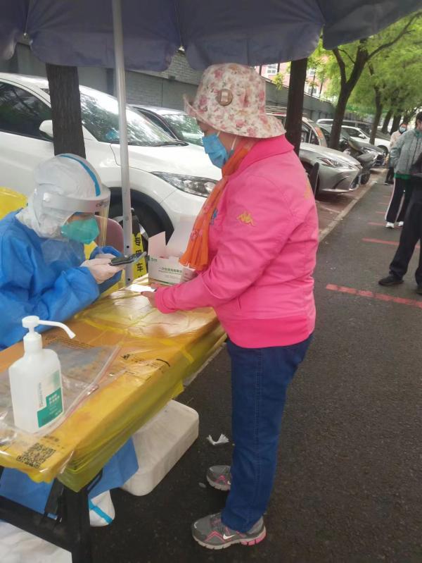 薛金萍在通州区新华园社区进行核酸绿色通道信息登记和发放口罩