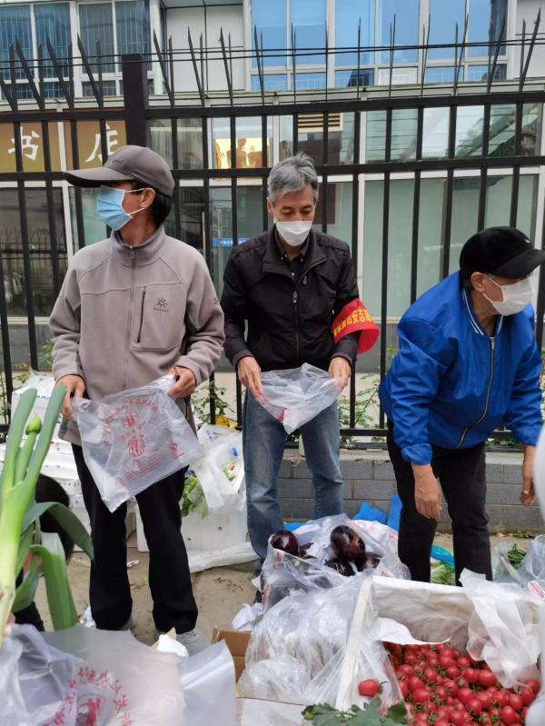 薛福江(中)在朝阳区潘家园东里社区为小区隔离居民送蔬菜