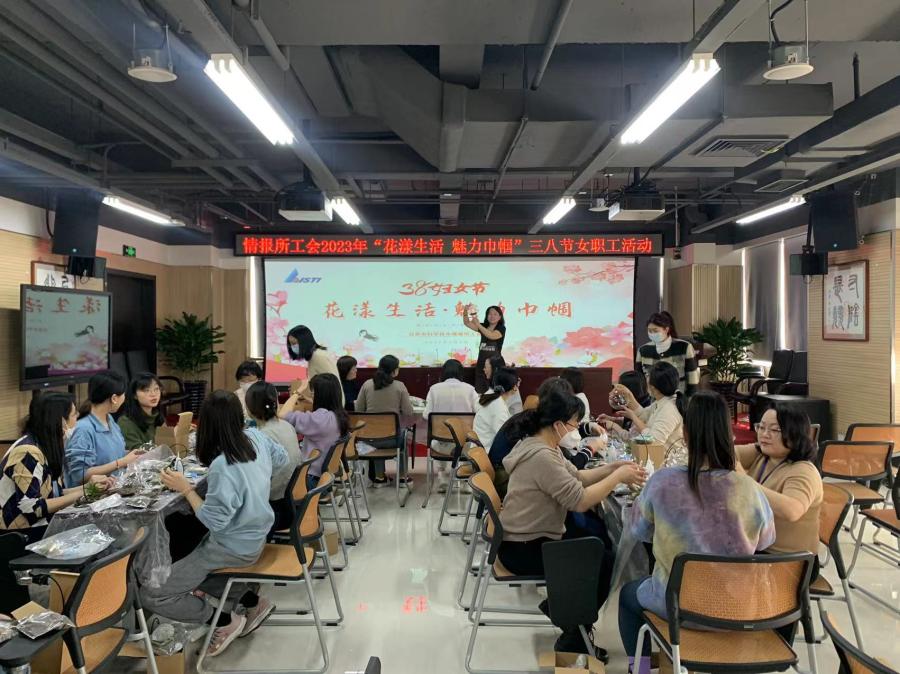 为进一步丰富女职工的精神文化生活,提高女职工的生活品味,在2023年“三八”国际妇女节即将到来之际,科技情报研究所工会于3月7日,在11层报告厅组织开展以“花漾生活 魅力巾帼”为主题的纪念活动,并为女职工们送上节日祝福。全所60余名女职工参加绿植微景观、永生花等设计制作活动。