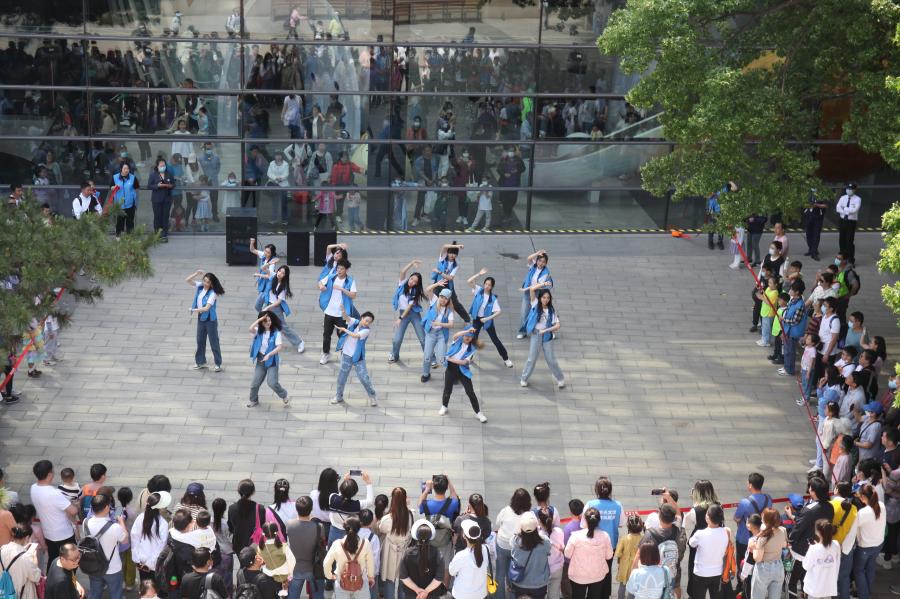 5月3日,一场歌舞快闪将此次系列活动推向高潮。表演开始时正值入馆高峰,歌曲《奔跑的青春》在天文馆广场响起,来自中央戏剧学院WeekDay街舞社的14名学生志愿者,将青年人的热情洋溢、活力四射展现的淋漓尽致,现场气氛被瞬间点燃,游客纷纷围拢上来,举起手机拍摄记录,并不时发出欢呼与喝彩声,活动现场欢快热闹,文明有序。充满正能量的歌词用时下流行的“快闪”形式演绎出来,青年人用志愿身份彰显青春风采,用志愿行动传承“五四”精神。