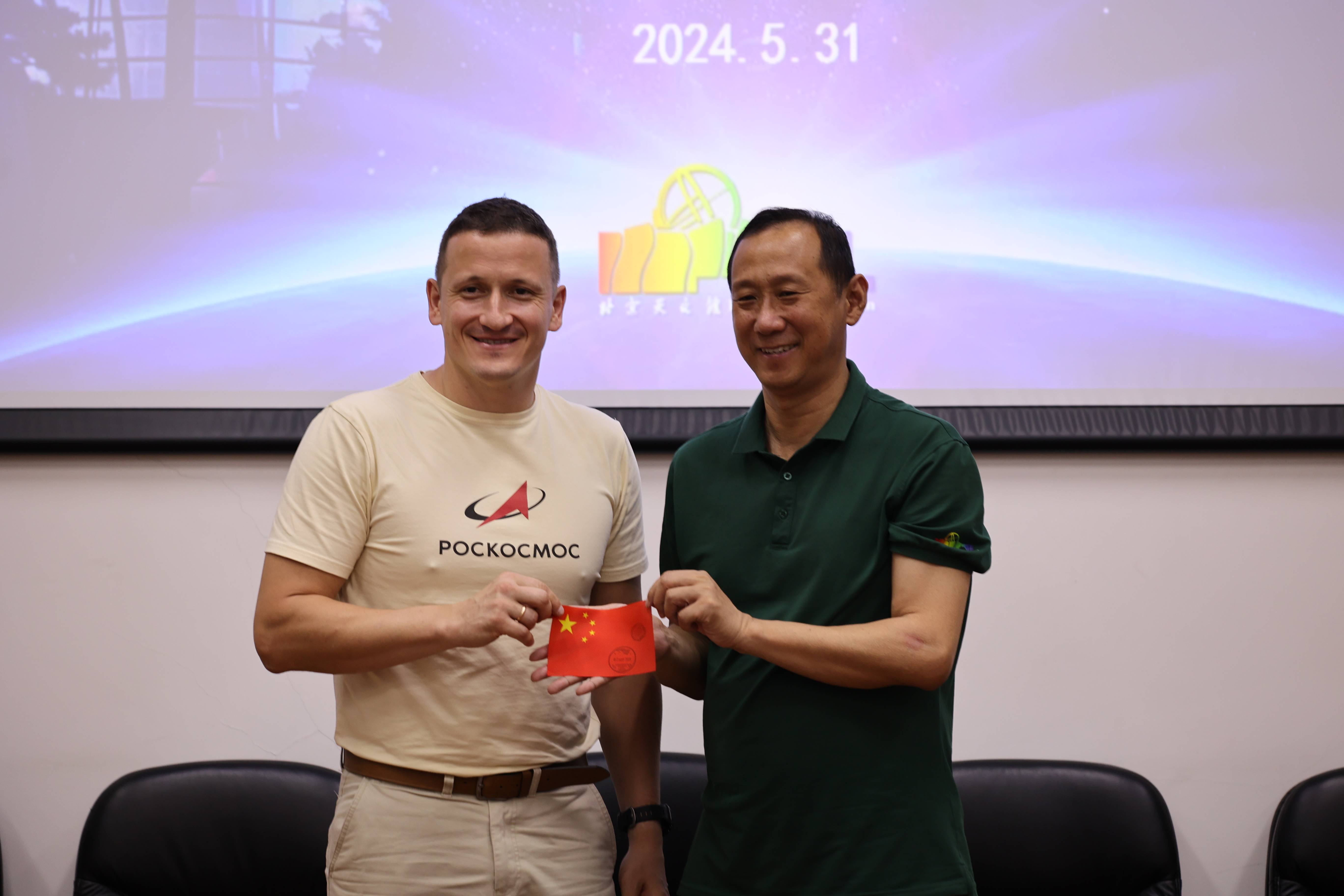 会上,谢尔盖向天文馆赠送了一件特殊的礼物——一面带有两枚印章的中国国旗,谢尔盖介绍到,这是与他一起在2020年执行首次太空飞行的一面国旗,圆形印章是国际空间站的俄方印章,八角形印章是国际空间站的国际印章。