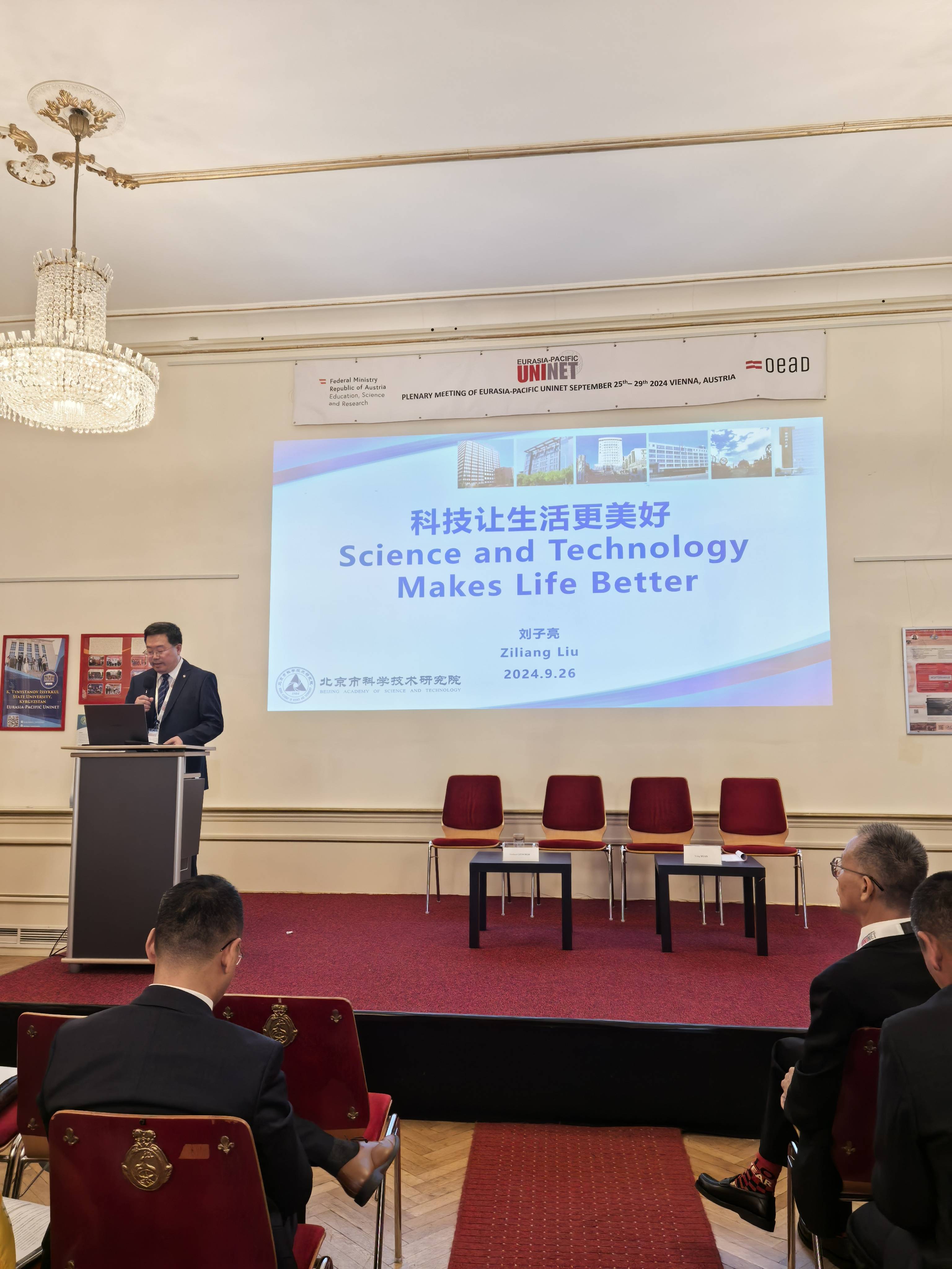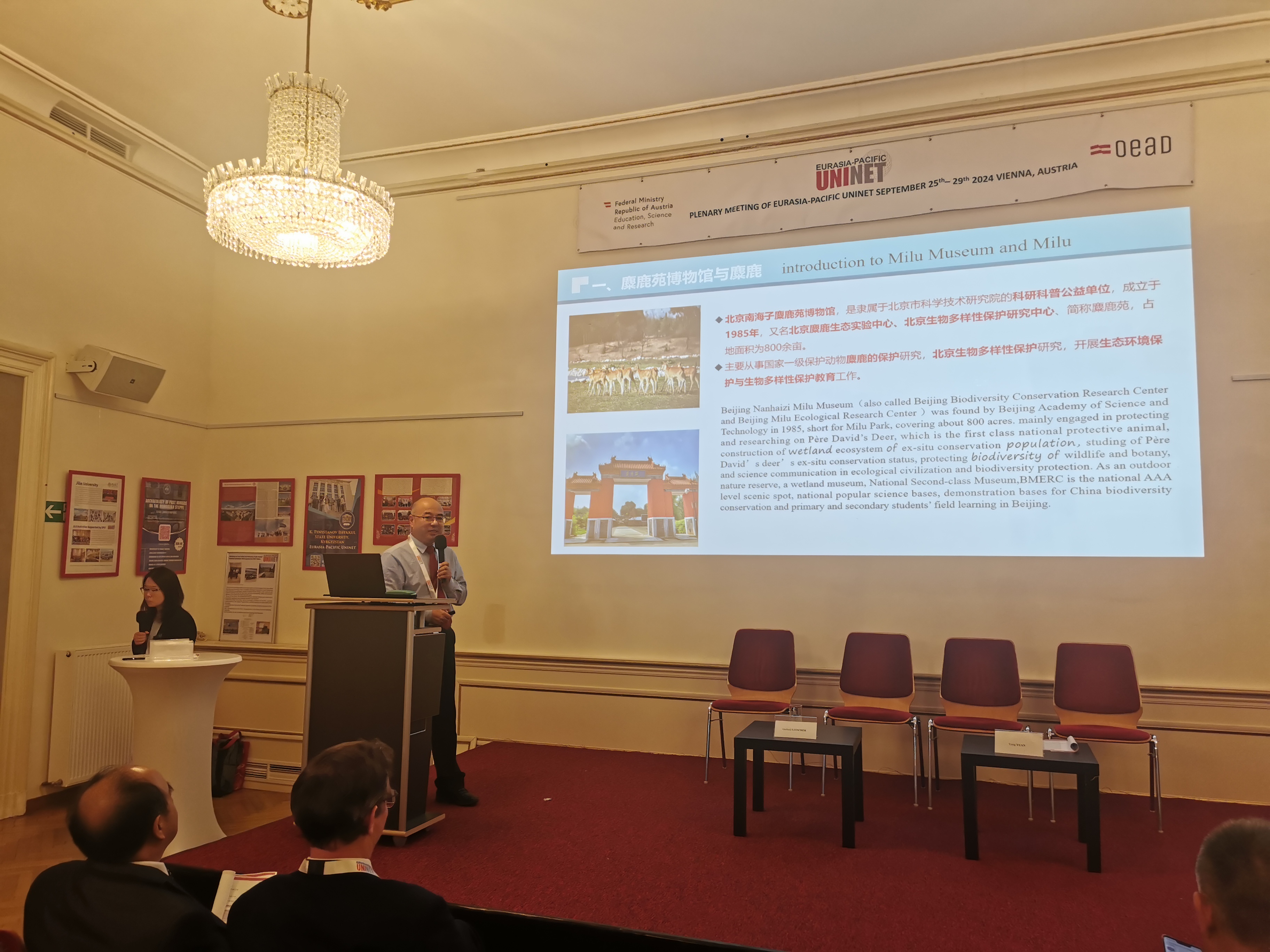 出访期间,代表团受邀出席欧亚太平洋学术协会(EPU)第七次全体会议,刘子亮作了题为《科技让生活更美好》的主旨报告,北京麋鹿生态实验中心主任白加德作了题为《播种——北京南海子麋鹿苑博物馆自然保护教育纪实》的主旨报告。欧亚太平洋学术协会(EPU)成立于2000年,旨在建立和推动奥地利科研院校和东亚、中亚及南亚地区科研院校间的联系与科学合作。成功促进了来自奥地利、中国、韩国、蒙古、俄罗斯和印度等多个国家的160个成员机构之间的多边科技合作与交流。2018年5月,EPU主席Wolf-Dieter Rausch教授访问北科院,双方签署战略合作协议,为深化北科院与欧洲地区科研机构与高校的合作奠定了基础。2023年EPU北京办事处落户北科院,成为连接中奥科技交流的纽带与桥梁。此次出访,进一步推动建立与欧洲科研机构和大学之间的科技交流机制,有效拓展和深化了科技创新合作。