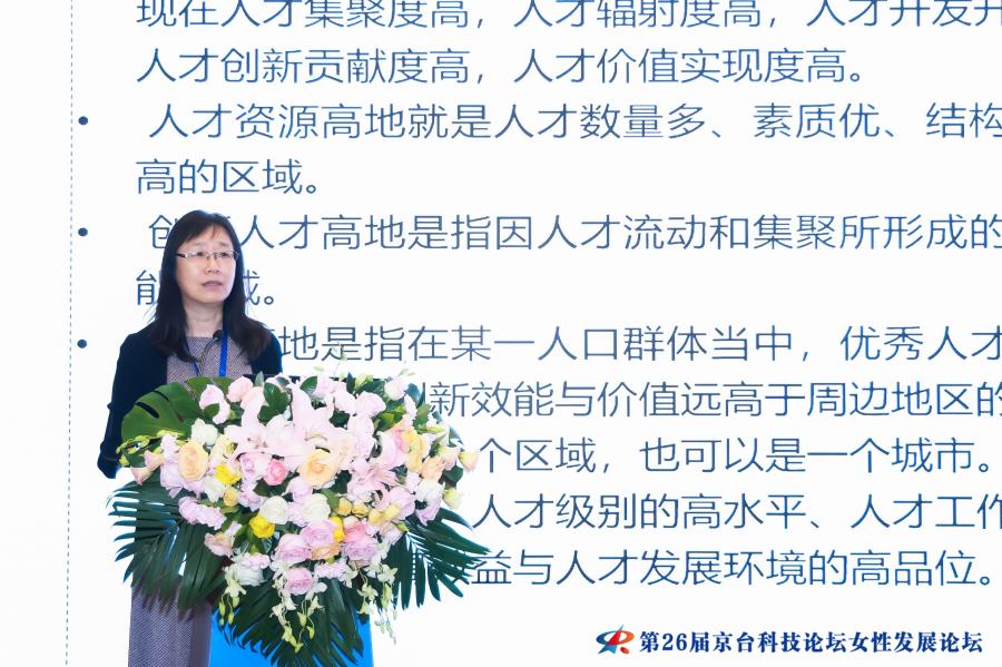 论坛特邀8名两岸杰出女性代表围绕“科技赋能女性发展 京台姐妹共赢未来”作主题报告。我院创新发展战略研究所所长、北京女科技工作者协会常务副会长伊彤在会上作了题为“优化科技创新生态,推进人才高地建设”的主题报告,通过对人才发展相关数据的量质分析,重点围绕高水平人才高地的内涵和特征、北京建设高水平人才高地的基础、北京现阶段存在的差距和问题等方面进行了分享,并针对加快建设高水平人才高地提出了相关思考和建议。