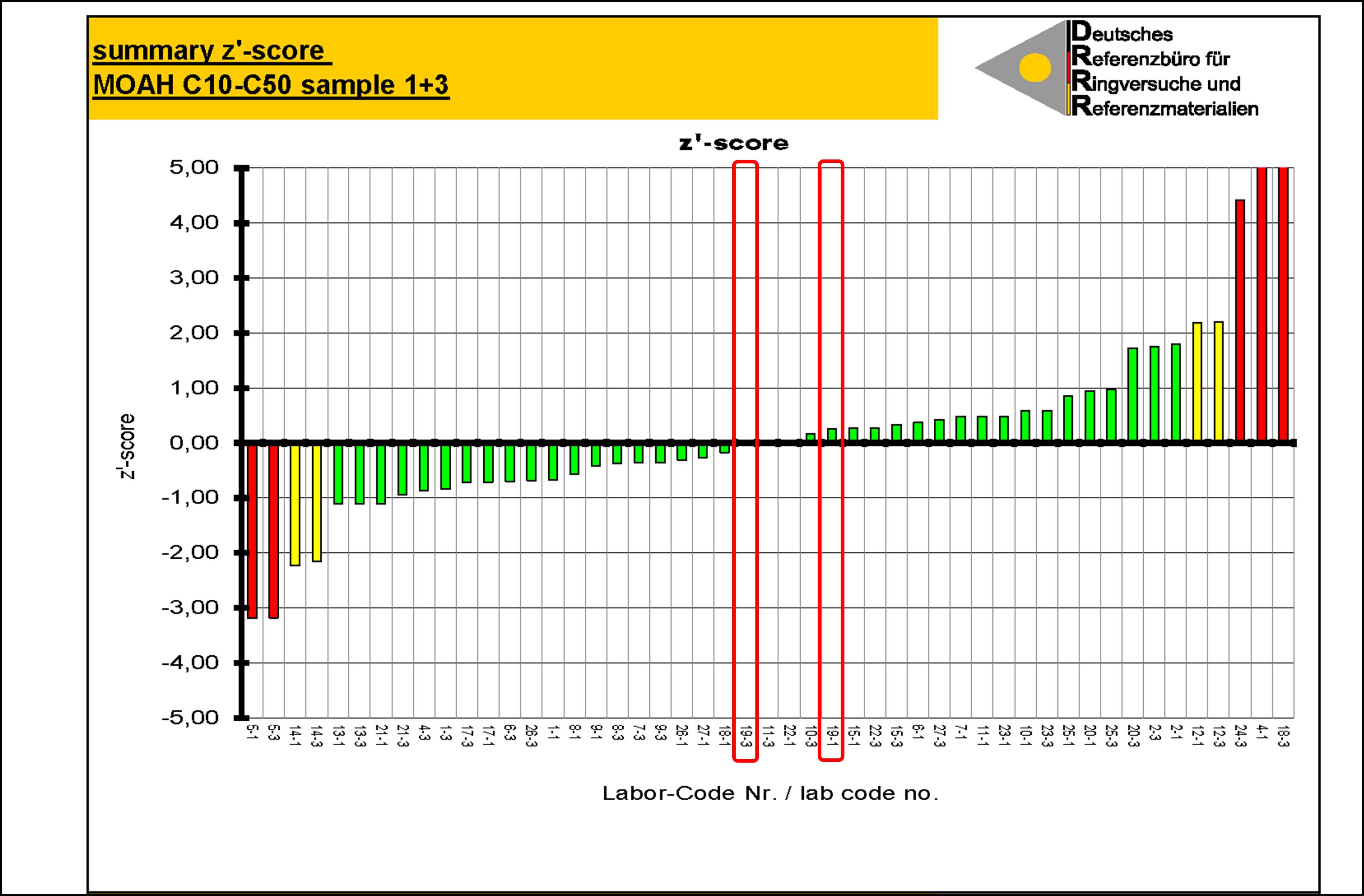 这次能力验证主要针对 4 个棕榈油样品中的矿物油成分进行检测,包括 2 个低含量样品和 2 个加标样品,涉及不同碳段的烷烃(MOSH)和芳烃矿物油(MOAH)。由于精炼棕榈油存在一些很难通过环氧化反应去除的“顽固”烯烃干扰物,对矿物油尤其是低含量 MOAH 的准确检测造成很大影响。本次验证有 2 个样品的 MOAH 含量低至约 1 mg/kg,极大考验实验室的检测能力。从验证报告看到:当样品中的 MOAH 含量大于 4 mg/kg 时,参与统计的实验室有 25 家;但当样品中的 MOAH 含量降到 1 mg/kg 左右时,能进入统计的实验室仅剩 15 家,低含量矿物油检测对实验室能力有极大挑战。