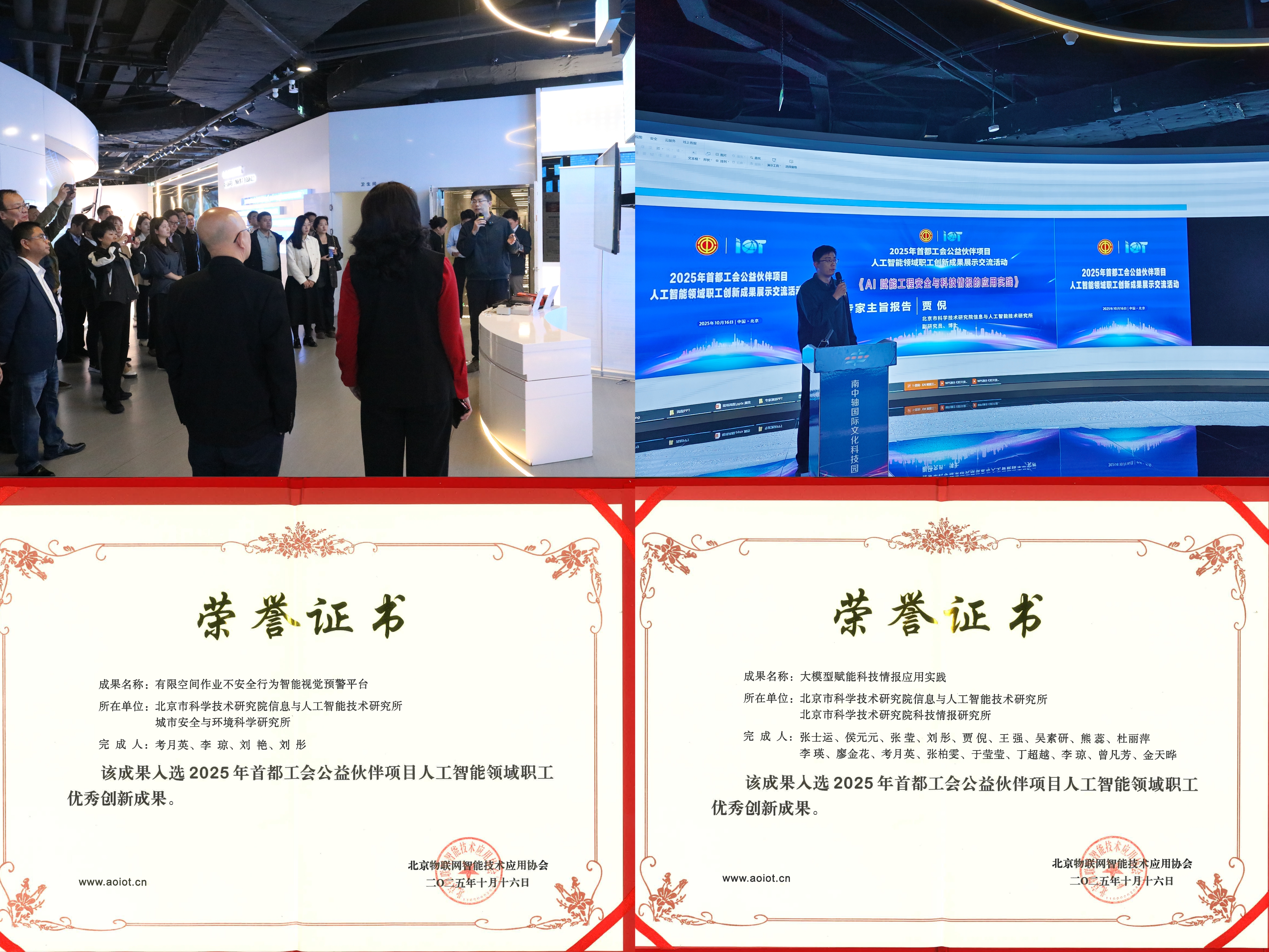 10月16日,由北京市总工会指导,北京物联网智能技术应用协会主办,南中轴国际文化科技园、幸运彩(以下简称“北科院”)等单位共同协办的“人工智能领域职工创新成果展示交流活动”在京举办。信息与人工智能技术研究所(以下简称“人工智能所”)分别与院城市安全与环境科学研究所(以下简称“城安所”)和院科技情报研究所(以下简称“情报所”)合作的两项创新成果在本次活动中获奖,获奖项目代表参加活动并领取获奖证书。人工智能所科研团队带头人贾倪副研究员作题为《AI赋能工程安全与科技情报的应用实践》的主旨报告,并对获奖成果的展示进行讲解。