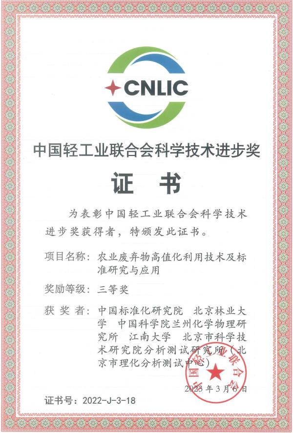 2023年4月11日,中国轻工业联合会五届三次、中华全国手工业合作总社八届三次理事会在福建省厦门市召开,会上为获得“2022年度中国轻工业联合会科学技术奖”的获奖单位颁发获奖证书。分析测试所作为参加单位,联合中国标准化研究院、北京林业大学等单位,申报的项目《农业废弃物高值化利用技术及标准研究与应用》获得2022年度中国轻工业联合会科学技术进步三等奖。