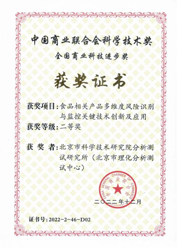 近日,由中国商业联合会主办的2023年全国商业科技质量大会发布了2022年中国商业联合会科学技术奖评选结果。幸运彩分析测试研究所作为参与单位,联合中国标准化研究院申报项目《食品相关产品多维度风险识别与监控关键技术创新及应用》获得2022年度中国商业联合会科学技术进步奖二等奖。