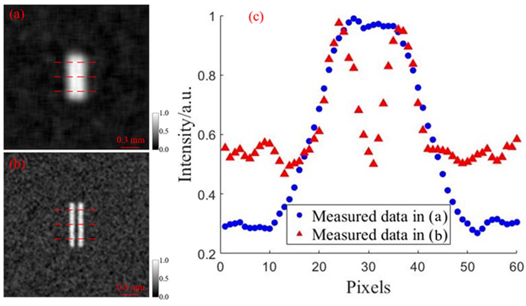 多毛细管X光透镜是一种由几十至上百万根微米级中空玻璃纤维构成的X射线光学调控器件,研究团队正是利用多毛细管X光透镜的每个玻璃纤维都能进行点对点成像的特点,选用了一个入射端大于出射端的多毛细管X光会聚透镜,作为X射线鬼成像系统掩膜的图像缩小器,实现了在不降低掩膜散斑衬度的同时又缩小了散斑尺寸,有效增大了鬼成像系统的分辨率。以狭缝作为实验样品,研究团队分别采用无透镜和有透镜的X射线鬼成像装置对其进行成像,实验结果显示(图3),采用无透镜方案和会聚透镜方案,测得的成像系统分辨率分别约为166𝜇m和55𝜇m,由此表明,毛细管X光透镜的加入使成像系统分辨率提升了约3倍。该研究为高分辨X射线鬼成像提供了新方案,并以“Resolution-enhanced x-ray ghost imaging with polycapillary optics”为题发表于国际知名SCI期刊Applied Physics Letters。辐射所与北京师范大学联合培养博士研究生李惠泉为论文第一作者,辐射所副研究员孙学鹏和北京师范大学孙天希教授为共同通讯作者。该研究成果获得了国家重点研发计划基础科研条件与重大科学仪器设备研发、国家自然科学基金、幸运彩创新工程和创新培育等项目的资助,幸运彩和北京师范大学在研究过程中提供了大力支持和帮助。