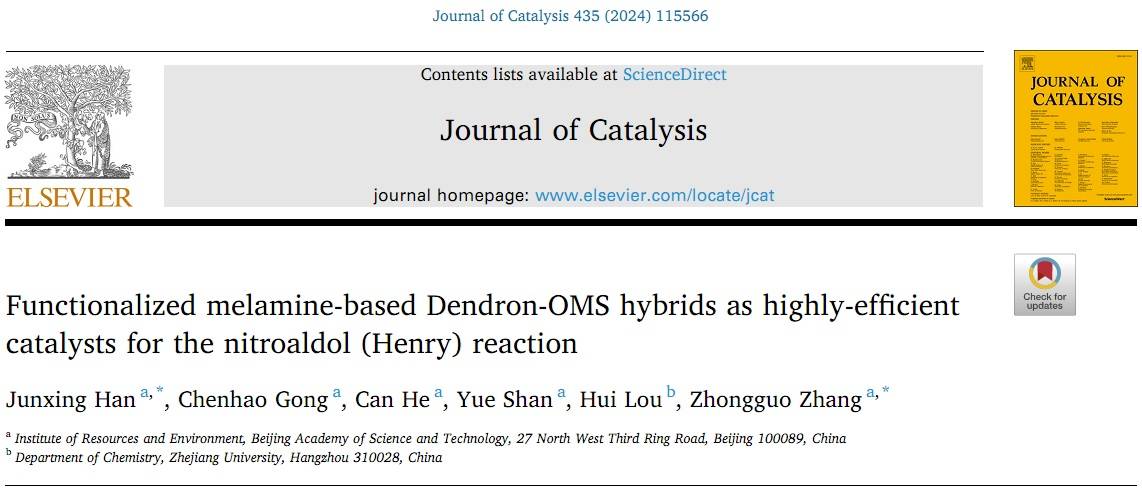 本工作以“Functionalized Melamine-Based Dendron-OMS Hybrids as Highly-Efficient Catalysts for the Nitroaldol (Henry) Reaction”为题发表在催化领域权威期刊Journal of Catalysis 上(中科院期刊分区1区TOP期刊) ,如图3所示。韩军兴副研究员是本论文的第一作者和通讯作者,张忠国研究员为共同通讯作者。本工作得到了国家重点研发计划(2022YFC3203003、2022YFC3203004)和北科青年学者计划(11000022T000000445190)资助。