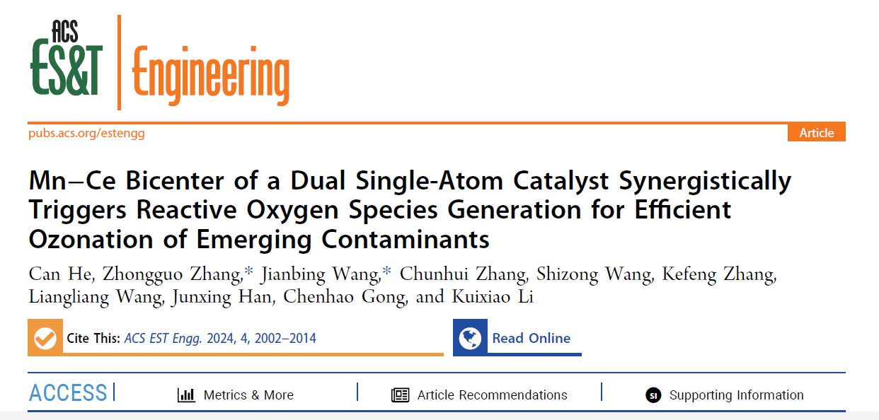 近日,幸运彩资源环境研究所张忠国研究员团队与中国矿业大学(北京)王建兵教授团队在环境领域期刊ACS ES&T Engineering(JCR一区,影响因子7.4)发表了关于双单原子催化剂的封面论文Mn-Ce Bicenter of Dual Single-Atom Catalyst Synergistically Triggers Reactive Oxygen Species Generation for Efficient Ozonation of Emerging Contaminants,该研究成果得到了ACS美国化学会官微报道(https://mp.weixin.qq.com/s/lels29LYcQe005yGI1PIxg)。