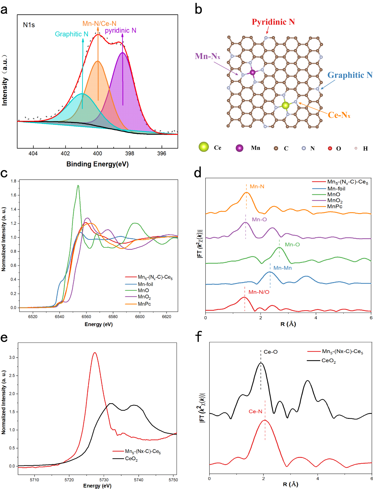 图2.催化剂N 1sXPS数据(a);N物种示意图(b);Mn K边XANES(c)和Mn FT-EXAFS(d);Ce K边XANES(e)和Ce FT-EXAFS(f)