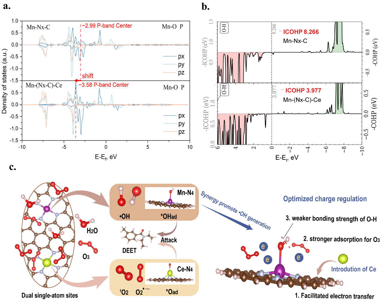 图3.(a)Mn-O的P带中心;(b)O-H键的晶体轨道哈密顿居群(COHP);(c)双中心协同触发ROS生成的机制图