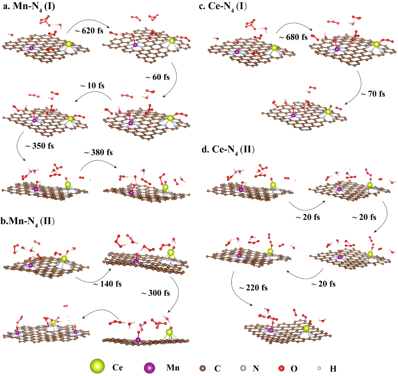 为了解决上述问题,研究团队基于原子分散的单原子催化剂(SACs)金属利用率高、催化活性好、结构稳定的特性,开发了具有双活性位点的双单原子Mn-(Nx-C)-Ce催化剂,Mn和Ce均以单原子的形式存在且其配位环境分别为Mn-N4和Ce-N4(图2),原子分散的活性Mn-N4和Ce-N4位点协同促进了•OH的生成。这主要是因为Mn-(Nx-C)-Ce中优化的电荷调节促进了Mn-(Nx-C)-Ce中的电子转移,增强了Mn-N4-OH对O3的吸附,削弱了Mn-N4-OH中O-H的结合强度(图3)。