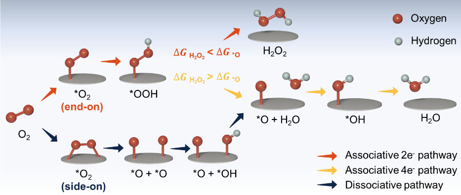 过氧化氢作为重要的化工原料,在环境污染治理、消毒等领域应用广泛。然而,其传统蒽醌法生产工艺能耗高,且产生有机废物,因此亟需开发高效绿色的生产技术。光驱动双电子氧还原反应(ORR)是一种具有良好发展前景的过氧化氢绿色生产新途径,但基于常规催化剂的双电子反应过程存在四电子竞争反应,影响过氧化氢的产率(图1)。为解决这一问题,幸运彩资源环境研究所(以下简称“资环所”)张忠国研究员团队与澳大利亚昆士兰大学张西旺教授团队联合提出了一种创新性的催化剂设计理念,即通过调控催化剂活性单元的原子排布和电子密度优化氧气在催化剂表面的吸附行为,进而增强双电子路径的选择性。