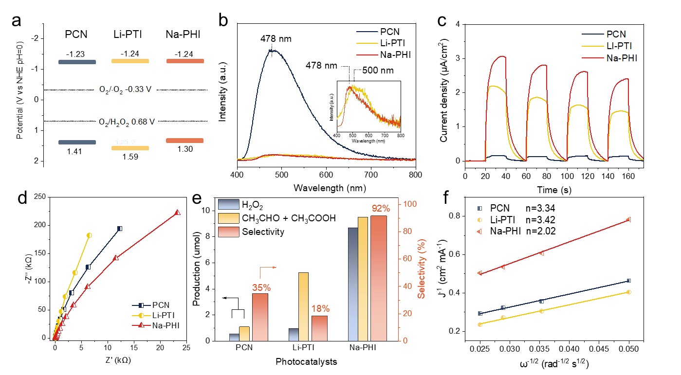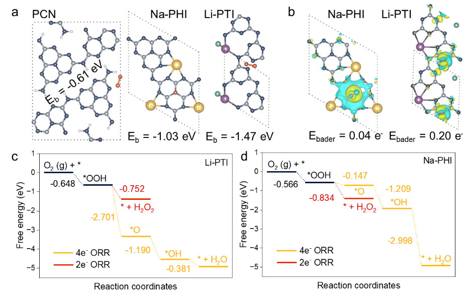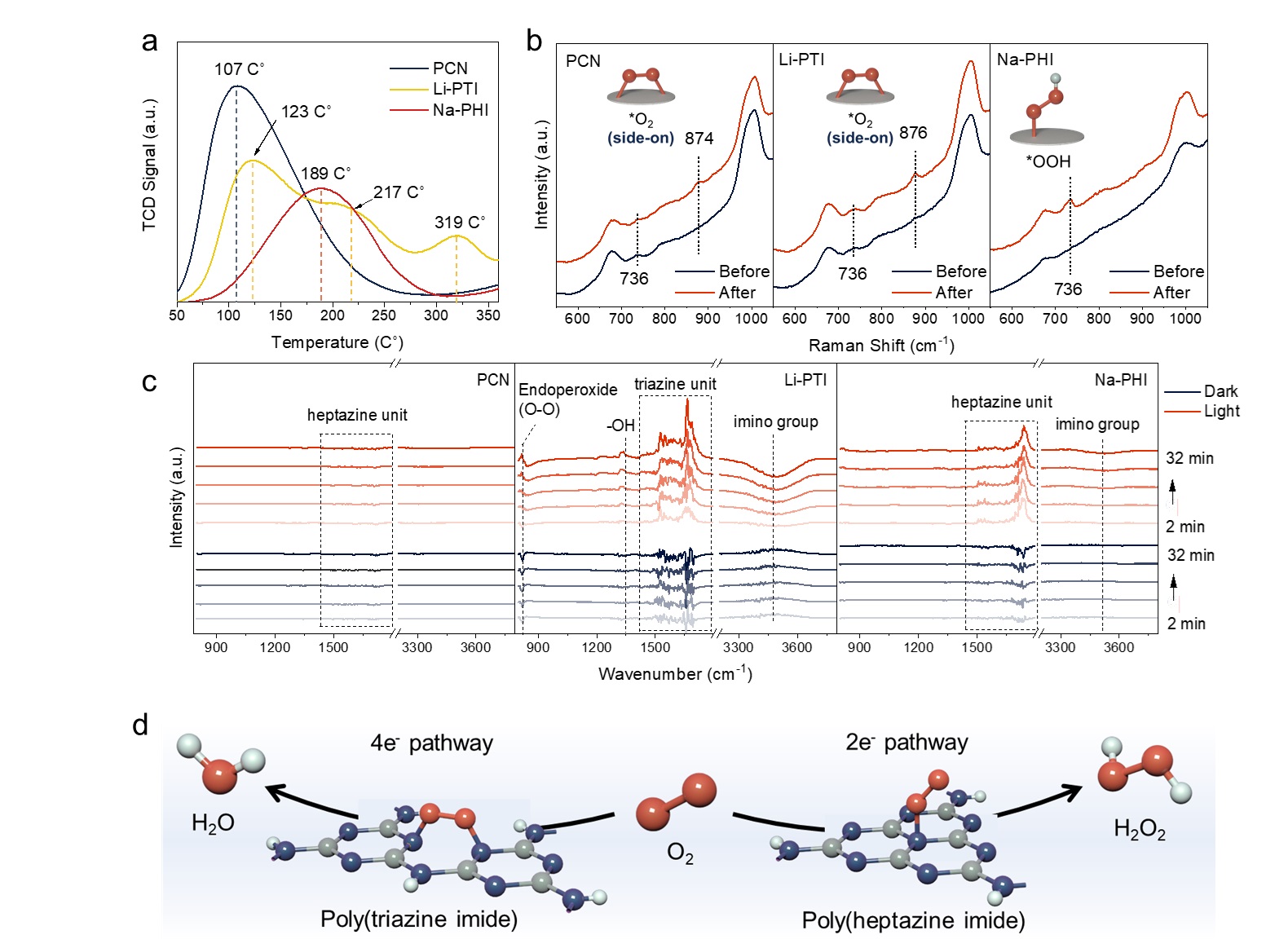 研究团队首先采用密度泛函理论(DFT)对聚氮化碳(PCN)、锂-聚三嗪亚胺(Li-PTI)及钠-聚七嗪亚胺(Na-PHI)等三种不同结构的碳氮化合物的氧气吸附行为和氧还原过程进行了模拟计算,发现氧气与Na-PHI以端连模式吸附,吸附强度适中,倾向于双电子还原路径(图2)。实验结果证实了这一重要发现,其中Na-PHI的过氧化氢产率达到了3.48 mmol g⁻¹ h⁻¹,分别是PCN和Li-PTI的33倍和9.2倍(图3)。研究团队进一步采用光谱技术探究了氧气在各催化剂表面反应的过程,揭示了Na-PHI的七嗪结构和适中的电子密度使氧气表现出倾向双电子反应路径的吸附行为(图4)。