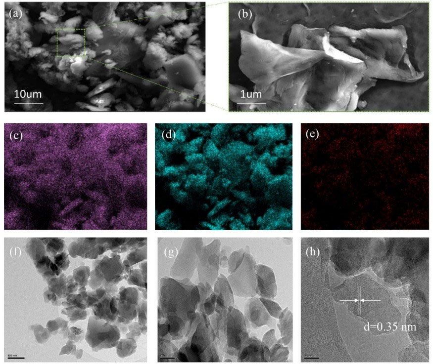 图1. PHI纳米片微观表征(a-b扫描电镜图,c-e能谱元素图,f-h透射电镜图)