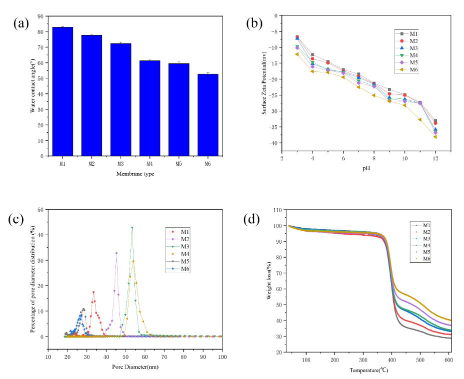 图3. 复合膜亲水性、表面电位、孔径分布及热稳定分析