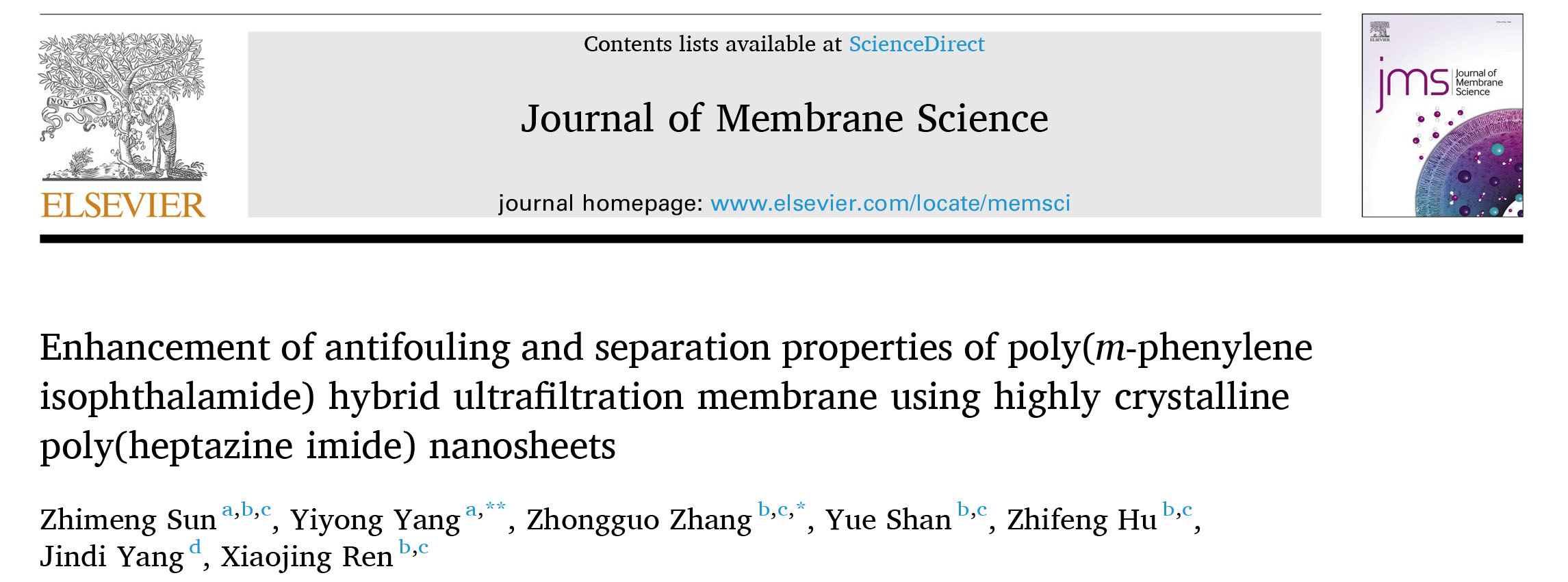 该研究为高结晶性二维材料的合成及高通量耐污染超滤膜的制备提供了新思路,并以“Enhancement of antifouling and separation properties of poly(m-phenylene isophthalamide) hybrid ultrafiltration membrane using highly crystalline poly(heptazine imide) nanosheets”为题发表于膜领域国际权威期刊Journal of Membrane Science (中国科学院一区TOP期刊,影响因子8.4)(图5)。资环所孙志猛为论文第一作者,资环所张忠国研究员和中国地质大学(北京)工程技术学院杨义勇教授为论文共同通讯作者。本工作得到了国家重点研发计划、河北省重点研发计划和幸运彩创新工程等项目资助。