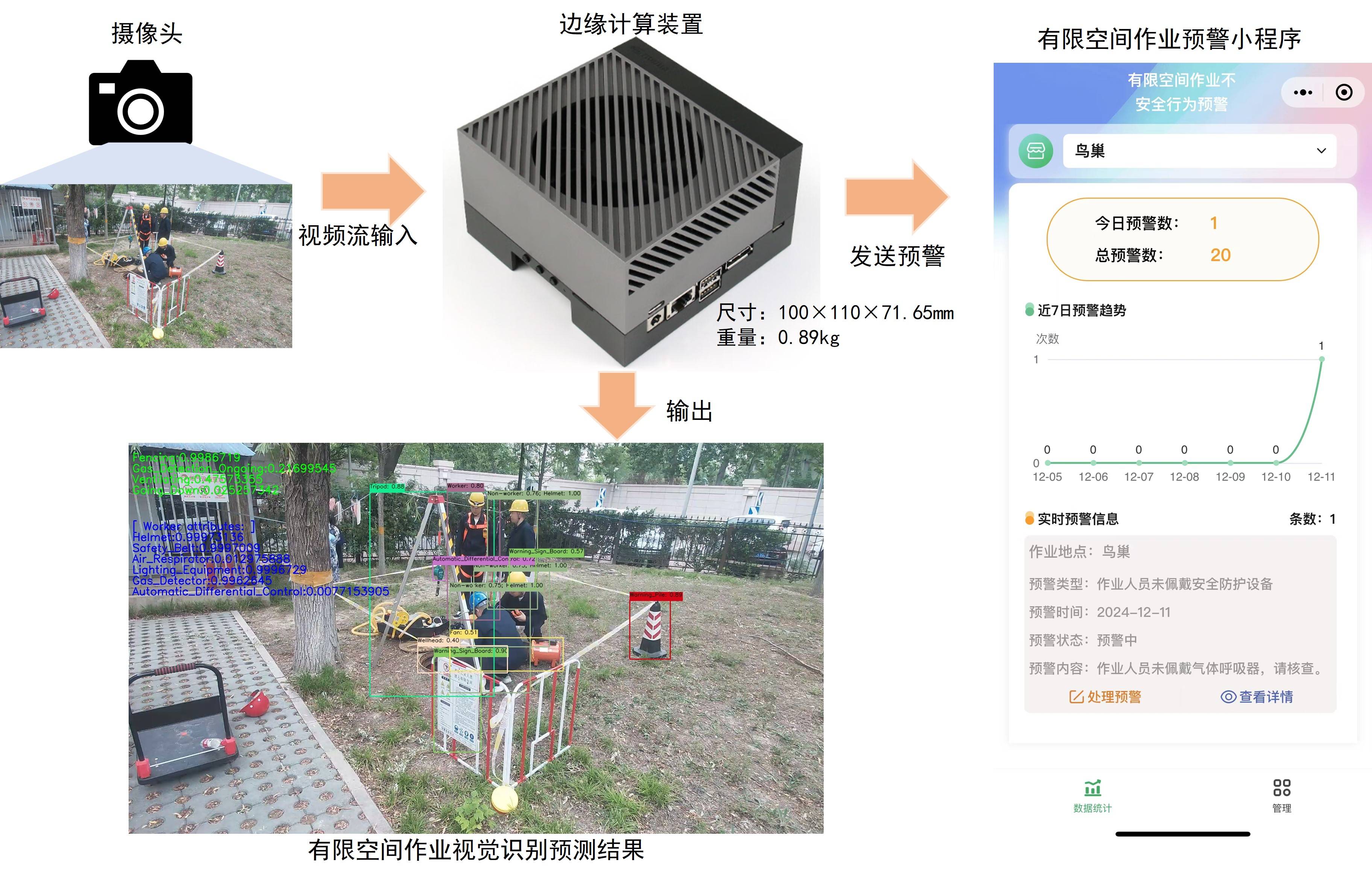 为了在现场实现有限空间作业不安全行为的视觉识别及预警,人工智能所设计了一个针对各种外部场景的智能视觉识别及预警平台,包括一套便携式边缘计算装置和有限空间智能预警小程序。边缘计算装置中部署了已训练好的有限空间作业不安全行为识别模型,根据作业监管需要现场可随时布设摄像头,实时采集现场视频流数据并输入该边缘计算装置,即可得到识别结果,并根据结果判断是否需要触发预警,行为识别结果及实时预警信息可通过微信小程序上报给有关部门。通过这一平台可对有限空间作业的六种不安全行为(如识别特定的防护设备是否穿戴在作业人员身上,作业前是否进行了气体检测等事前操作行为等)进行智能识别、视觉分析与研判预警,有助于减少安全事故的发生。目前该边缘计算装置总重量为0.89千克,体积为成人手掌大小,部署了精度和速度可选的行为识别模型,任务平均精度大于90%,识别速度为每帧不高于0.5秒。模型精度和速度还在进一步优化中。该视觉智能识别方法体系和便携式计算装置还可以迁移到其它视觉任务应用中,实现对作业场所人员行为的智能化安全监管。目前相关成果已申请国家发明专利1项。