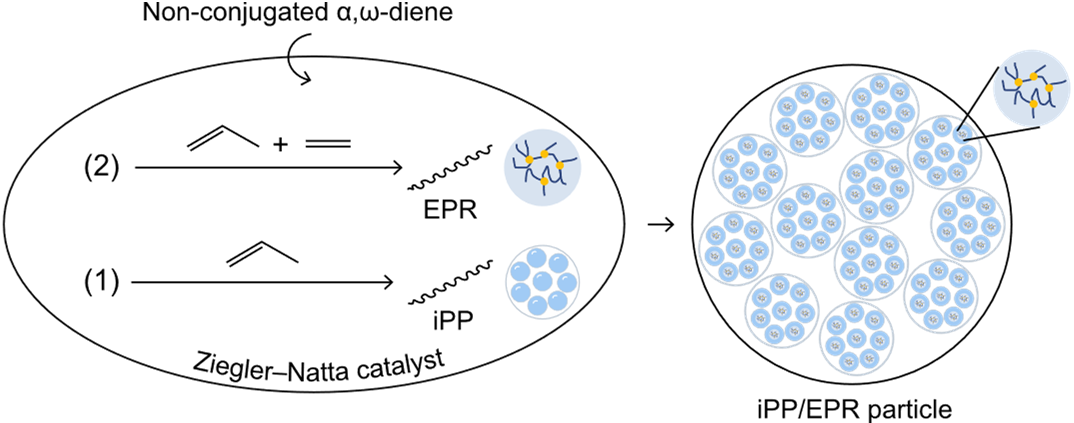 图1.支化交联聚丙烯多相共聚物的制备示意图