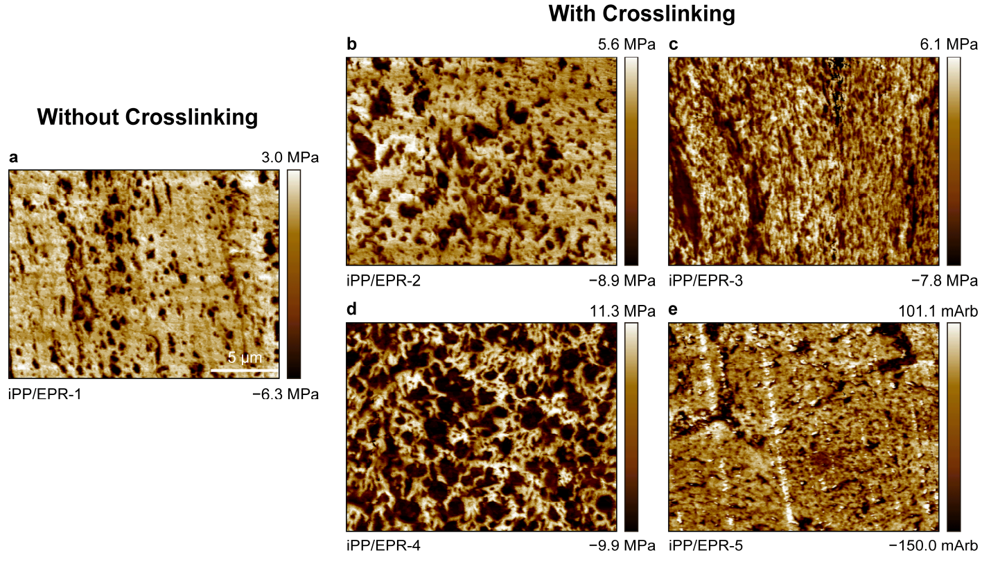 图2.支化交联和非支化交联聚丙烯多相共聚物的内部形貌AFM照片