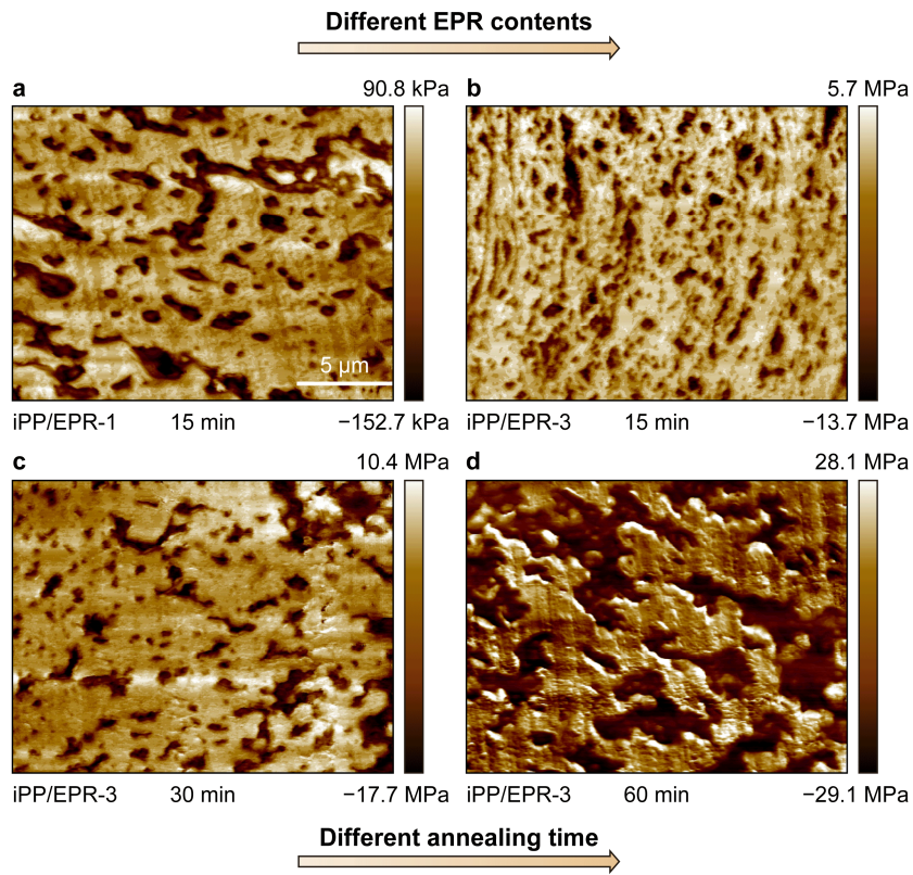图3.支化交联聚丙烯多相共聚物合金在不同EPR含量 (a, b) 和不同退火时间 (c, d) 的相结构演化AFM照片