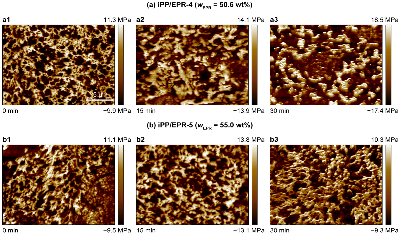 图4.高橡胶相含量支化交联聚丙烯多相共聚物在加工过程中的相结构演化AFM 照片