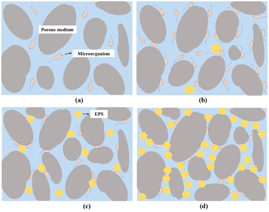 研究发现,EPS溶液具有假塑性,且随着浓度的增加,剪切稀化的能力逐渐增大,并且酸性(pH=1.5-3.5)和碱性(pH=9.5)都会影响该EPS溶液的粘度(图1)。X-CT三维图结果表明(图2),随着时间的增加,砂柱的孔隙率逐渐降低,但加入微生物组,由于EPS的产生,240 h后砂柱孔隙率降低68.20%,远大于空白组的12.52%。微生物和EPS协同降解土壤孔隙率主要分为四个阶段(图3):第一阶段,微生物的生长繁殖,产生大量细菌;第二阶段,土壤颗粒表面微生物的积累与吸附;第三阶段,EPS的生成;第四阶段,EPS的迁移与积累,使得土壤颗粒紧密结合,降低其内部孔隙。