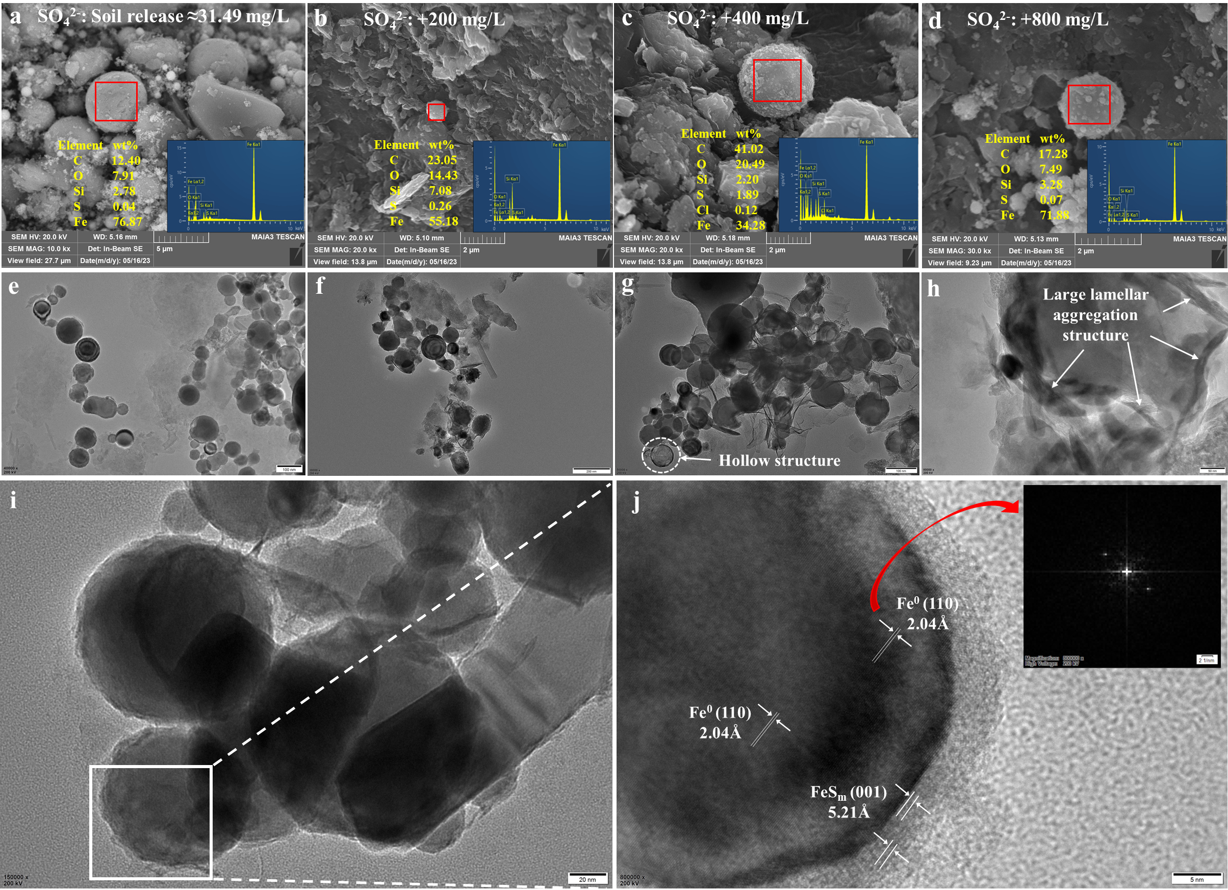 图2.反应后纳米ZVI-生物刺激耦合体系中铁颗粒的 SEM-EDS及其对应的HRTEM表征结果