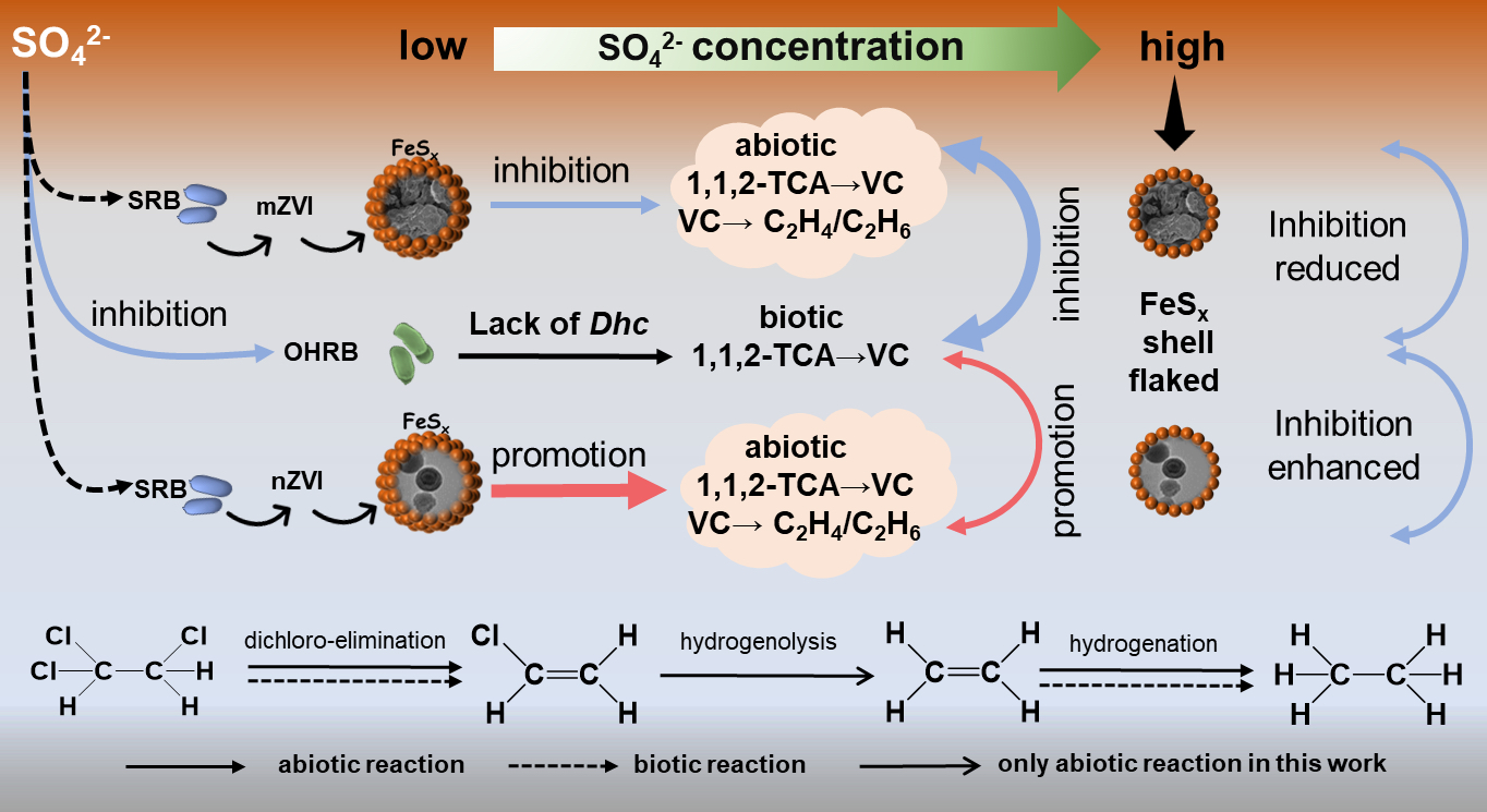 图3.SO₄²⁻对ZVI耦合生物刺激降解1,1,2-三氯乙烷的作用机理示意图