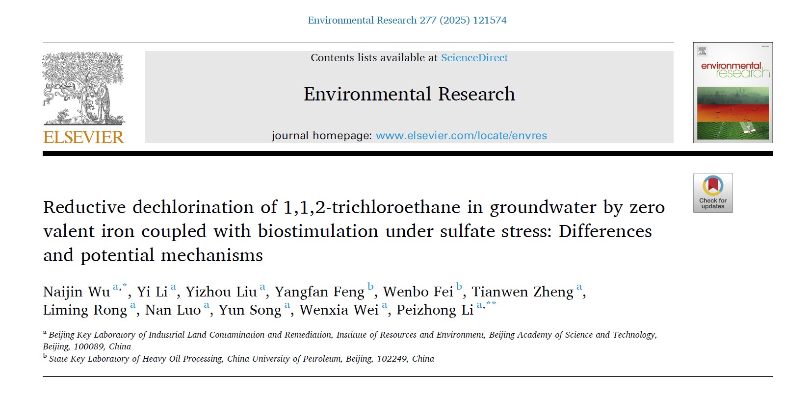 本研究得到了国家自然科学基金、北科院优秀青年人才及北科青年学者项目资助,并以“Reductive dechlorination of 1,1,2-trichloroethane in groundwater by zero valent iron coupled with biostimulation under sulfate stress: Differences and potential mechanisms”为题发表于Environmental Research期刊(JCR一区,影响因子7.7),如图4所示。北科院资环所土壤环境研究中心吴乃瑾研究员为本论文的第一和通讯作者,李培中研究员为共同通讯作者。