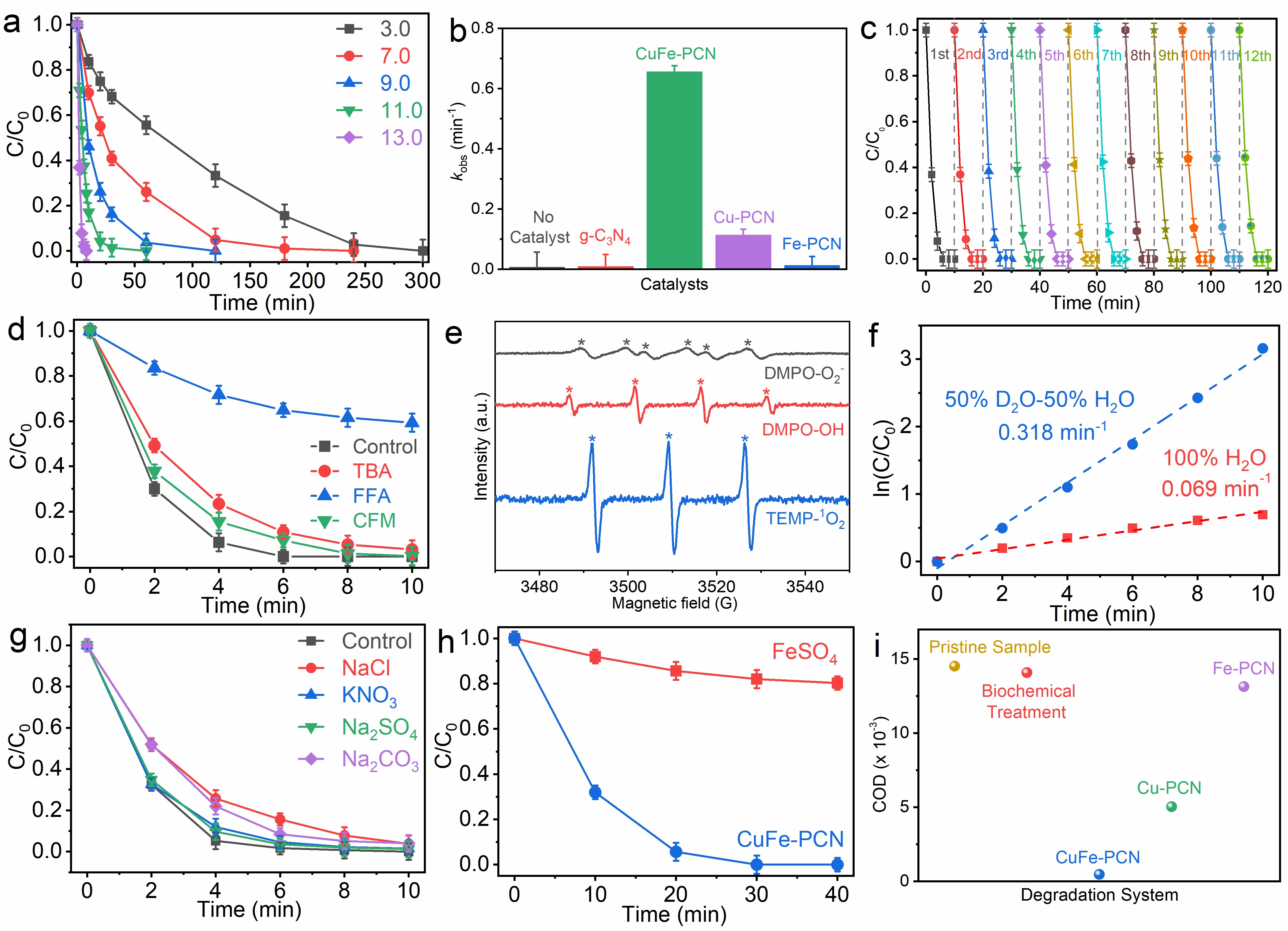 CuFe-PCN/H2O2碱性类芬顿体系除了对染料废水具有优异的降解性能外,还可以实现对高盐布洛芬类抗生素废水以及畜禽养殖废水的高效降解。传统芬顿反应在酸性溶液中通过FeSO4活化过氧化氢产生羟基自由基,但是高盐废水中羟基自由基超高的氧化电位导致对废水中无机盐阴离子、有机污染物的无差别攻击,使得布洛芬的降解选择性较差,反应40 min后布洛芬的去除率不足20%。CuFe-PCN/H2O2碱性类芬顿体系以氧化电位适中的单线态氧作为主要活性氧物种,提高了对布洛芬等有机污染物的靶向降解选择性,反应30 min后布洛芬的去除率超过了99% (图2h)。需要特别指出的是CuFe-PCN/H2O2碱性类芬顿体系对畜禽养殖废水具有优异的降解能力。畜禽养殖废水原水的COD值高达14000;采用传统生化方法处理三天后,COD的去除率不足3%;采用CuFe-PCN/H2O2碱性类芬顿体系降解3h后COD去除率超过了97% (图2i)。上述研究结果表明CuFe-PCN/H2O2碱性类芬顿体系对于实际废水治理具有非常好的应用前景。