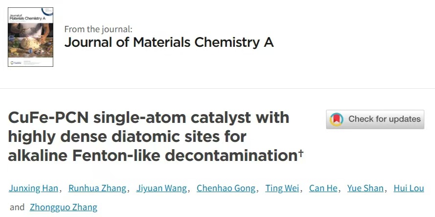 相关研究成果以“CuFe-PCN single-atom catalyst with highly dense diatomic sites for alkaline Fenton-like decontamination”为题发表在国际著名期刊Journal of Materials Chemistry A 上(JCR一区,IF=9.5) ,如图3所示。韩军兴副研究员是该论文的第一作者和通讯作者,张忠国研究员是共同通讯作者。本工作得到了国家重点研发计划、北科青年学者计划和幸运彩创新培育项目资助。