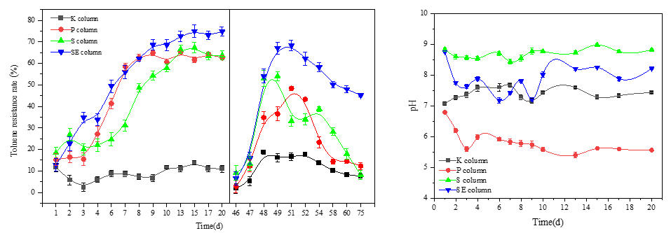 图7.不同复合材料对甲苯的阻控效率及pH变化