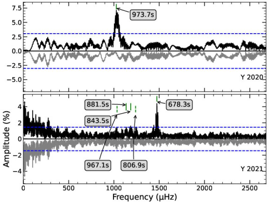 脉动白矮星是一种由自身内部非径向的引力波脉动造成星体不停收缩和膨胀而导致光度变化的特殊白矮星。通过对TMTS中白矮星光变的检查,TMTS J2345被发现为可能的脉动白矮星候选体。通过5个夜晚的后续测光观测以及对光变数据的频谱图分析证认出6个不同的脉动频率(图1)。然后利用基于恒星演化模型MESA的脉动白矮星WDEC软件计算出的高达756万个理论模型,对证认出的6个脉动频率进行星震学模型拟合。