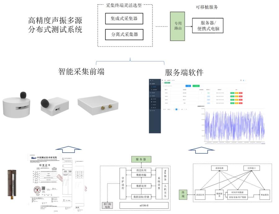 目前,要实现标准测量级精度、分布式部署、大通道数高并发同步采集的声与振动测量需要借助昂贵的采集仪器并在测试场地搭建较为复杂的系统完成,且面临采集平台通用性弱,无法支撑复杂场景现实应用的问题。