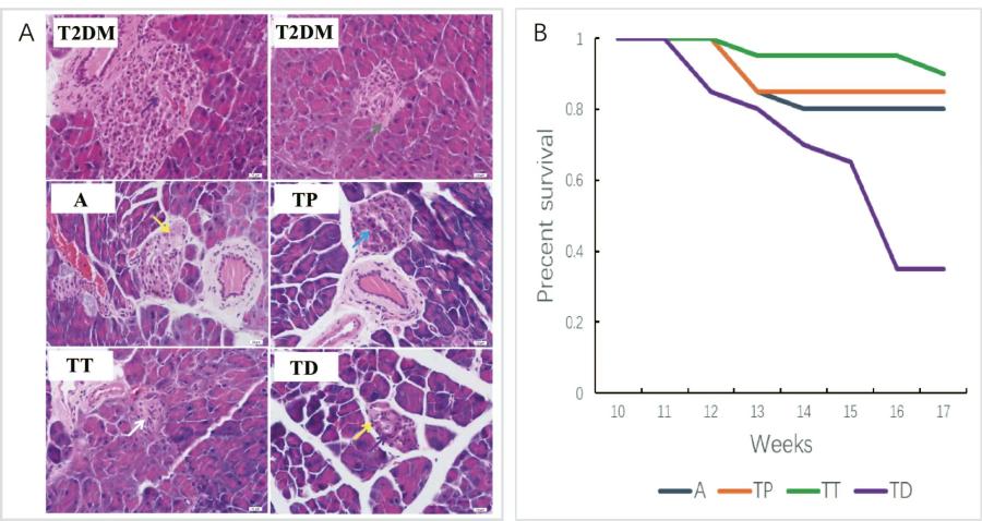 图A肠道菌群移植于2型糖尿病小鼠胰脏HE染色的病理切片(40×)。图B各组小鼠生存曲线。