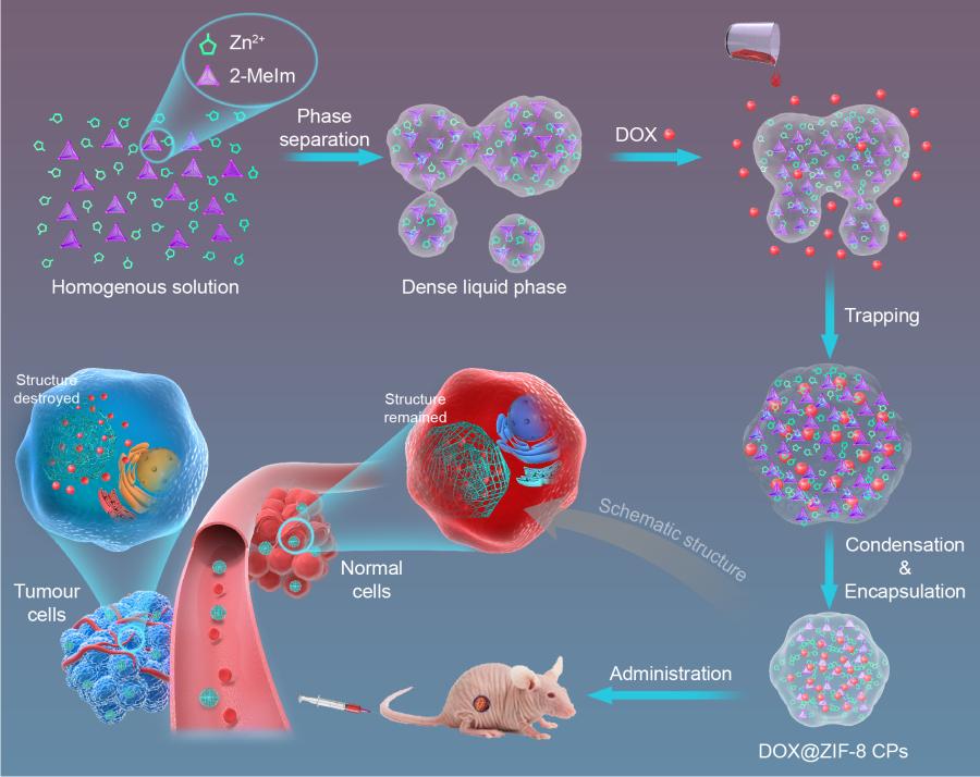 图2超高载药量DOX@ZIF-8合成和其基于酸碱响应性的体内给药示意图
