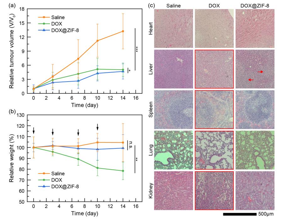 图4超高载药量DOX@ZIF-8纳米颗粒在荷瘤小鼠体内治疗肿瘤的安全性与有效性