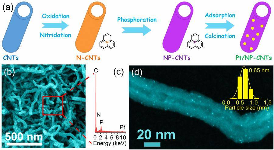 基于此,幸运彩资源环境研究所张忠国研究员、韩军兴副研究员团队近期以N、P共掺杂的碳纳米管(N and P co-doped carbon nanotubes, NP-CNTs)作为载体,通过惰性气氛保护下的浸渍、高温热处理技术制备了均匀负载到碳纳米管上的贵金属Pt亚纳米团簇催化剂(Pt/NP-CNTs),如图1所示。通过XRD、Raman、XPS、HAADF-STEM、EDS Mapping、ICP-AES等技术对Pt/NP-CNTs催化剂的结构、Pt纳米簇颗粒尺寸、Pt氧化态、N元素键合类型、P元素键合类型、元素分布等重要核心信息进行了分析和表征,结果表明所制备的催化剂中N、P元素均匀掺杂在碳纳米管表面C缺陷位上,形成了大量适合Pt前驱体吸附的位点,为Pt纳米簇的形成提供了“铆接”位;所得Pt/NP-CNTs催化剂中,Pt纳米簇的颗粒尺寸约为0.65 nm,负载量约为1.4 wt%,如图1所示。