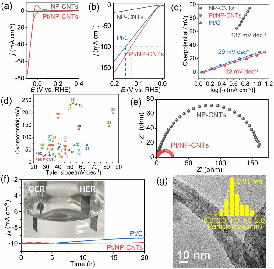 在酸性电解液中,Pt/NP-CNTs表现出极其优异的电催化析氢反应性能:起始电位、η10电位、Tafel斜率、稳定性等重要性能指标均优于商业贵金属Pt/C催化剂。如图2a所示,未负载Pt纳米簇的NP-CNTs载体几乎没有析氢反应性能,而负载Pt纳米簇后,CV曲线中出现了明显的氢析出峰,进一步结合XPS价态表征、电化学活性表面积测试证明负载到碳纳米管表面的零价Pt纳米簇是电催化析氢反应的活性位。如图2b和2c所示,在Pt/NP-CNTs催化剂上析氢反应达到10 mA cm-2 (η10)电流密度时的过电位为25 mV (vs. RHE),相对应的Tafel斜率为28 mV dec-1,均低于商业Pt/C催化剂(29 mV,29 mV dec-1)和目前文献中报道的绝大多数电催化析氢催化剂(图2d)。在Pt/NP-CNTs催化剂上析氢反应的Tafel斜率接近30 mV dec-1,表明在Pt/NP-CNTs催化剂上析氢反应遵循Volmer-Tafel机理,即化学吸附态的H*重新结合形成H-H是反应的速控步(RDS)。