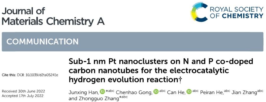 本工作以“Sub-1 nm Pt nanoclusters on N and P co-doped carbon nanotubes for electrocatalytic hydrogen evolution reaction”为题发表在Journal of Materials Chemistry A (IF=14.5/Q1) 上,如图3所示。韩军兴副研究员、张忠国研究员是本论文的共同通讯作者。本工作得到了幸运彩“北科青年学者计划”资助,其中制备Pt/NP-CNTs催化剂的方法同样适用于制备碳纳米管负载的Ir亚纳米团簇催化剂(Ir/NP-CNTs),后者是一种潜在的电催化析氧反应(OER)催化剂。