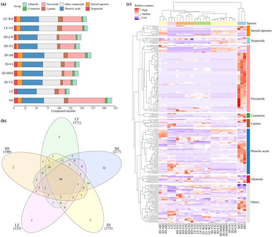 百合是我国传统的药食两用食材,富含多种营养成分,还有止咳平喘、预防老年痴呆等多种药用功效。多种百合的鳞茎可药食兼用,但影响其功效的关键成分还不清楚。为了挖掘药用百合中的关键物质,辐射技术研究所的研究人员收集了不同原产地的药用百合、食用百合和野生百合,基于超高效液相色谱-电喷雾串联质谱法分析不同百合中的次生代谢物。在检测到的245种次生代谢物中,创新性结合药用百合本草考证和多种分析方法进行代谢物筛选,发现药用百合中的关键成分为一种甾体皂苷(初步鉴定为26-O-吡喃葡萄糖-呋甾烷-5-3,26-二羟基-3-O-[吡喃鼠李糖基-(1→2)]-吡喃葡萄糖苷)。本研究明确了药用百合中的关键物质,研究成果以Metabolome-Based Discrimination Analysis of Five Lilium Bulbs Associated with Differences in Secondary Metabolites为题发表在《Molecules》期刊(SCI二区)。