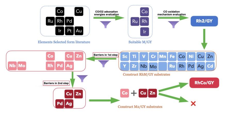 图1石墨炔载体上从金属单原子到双原子理性设计工作流程图