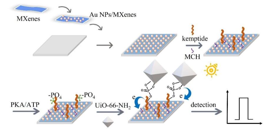 结合分析测试研究所在分析检测领域的科研优势,刘向文团队利用金属有机框架材料(MOFs)的化学可调谐性,在其表面进行修饰,制备出UiO-66-NH2光响应探针,并利用Au纳米颗粒与Mxenes组成的基底复合材料,成功构建生物分子传感体系并实现了对肿瘤细胞中蛋白激酶的高灵敏度的特异性识别。该方法具备MXenne的还原性以及金纳米颗粒的导电性和生物相容性等多功能的特点,不仅为高效、简捷的检测蛋白激酶活性提供了可行的光电检测策略,为更广泛的生物活体原位电化学研究提供了理论基础和技术支持。